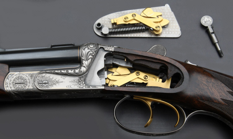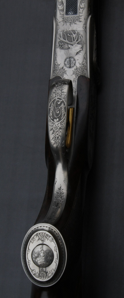 Heym Seitenschloss Doppelbüchse 88B, nach Kundenwunsch mit eigenem Hund. |