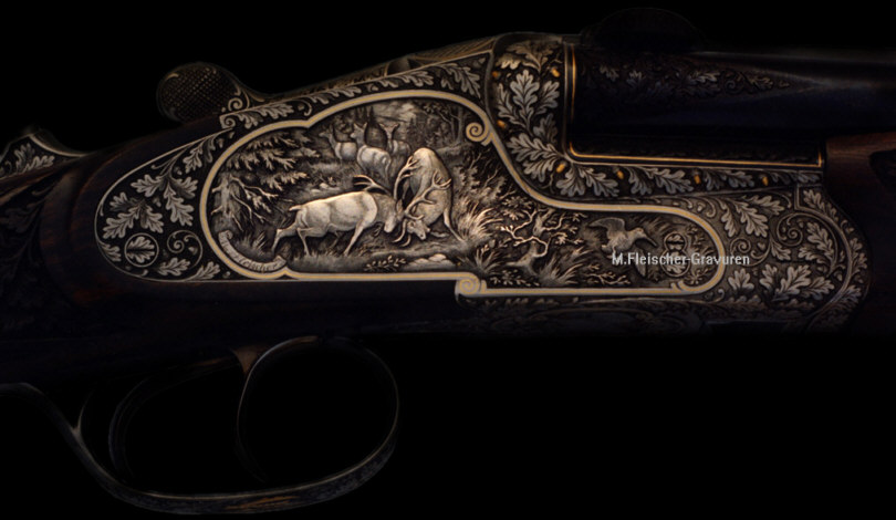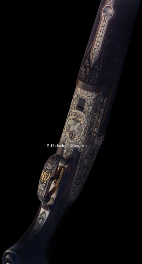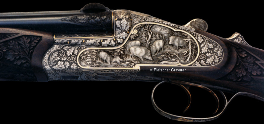 | Heym Doppelbüchsdrilling klassische deutsche Jagdszenengravur | |
