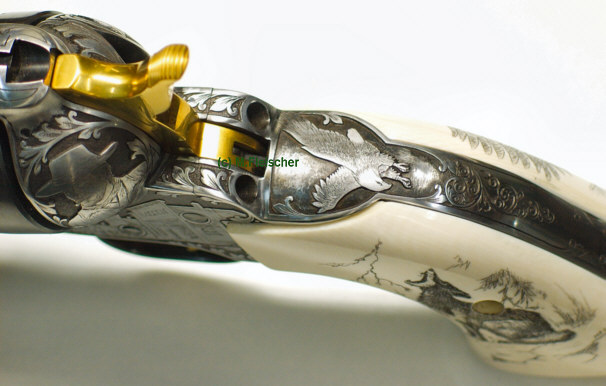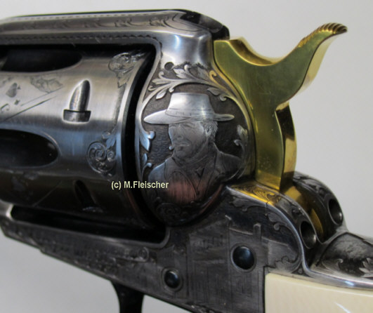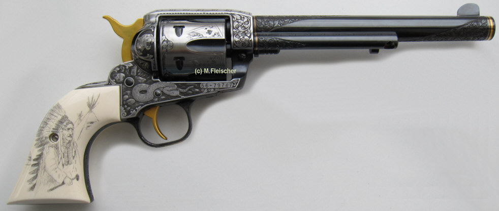 | Revolver graviert mit Amerikanischen Westernszenen | Revolver: Hahn und Abzug vergoldet. | |||