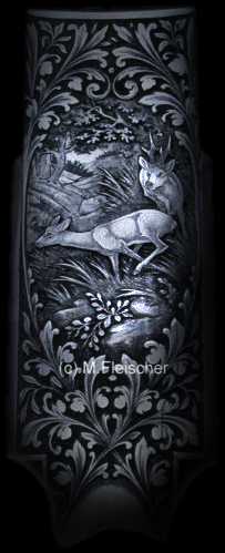 Jagdszenengravur tiefgestochen mit Arkantus oder Deutschem Laub