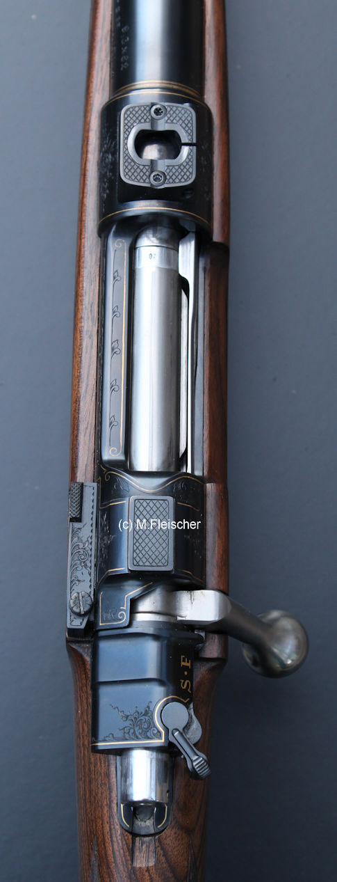 Neues System Prechtl Mod 98 Repetierbüchse Gravur: Goldlinien mit Arabesken. | |